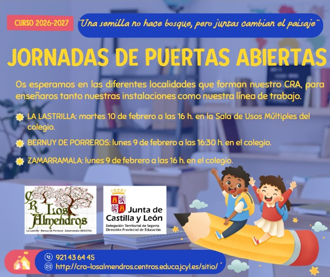 -El Colegio Rural Agrupado Los Almendros, es un centro educativo público, que atiende a los niveles de Educación Infantil y Primaria. El centro tiene dependencias en tres localidades: BERNUY DE PORREROS, LA LASTRILLA y ZAMARRAMALA. Todas ellas próximas a la capital SEGOVIA. La cabecera del centro está en La Lastrilla y nuestra dirección es: C/ Camino de San Cristóbal, 1. 40196. La Lastrilla - Segovia. HORARIO SECRETARÍA: Lunes a viernes de 9:05 a 10:30. Teléfono: 921436445 Fax: 921429131 E-MAIL: 40008342@educa.jcyl.es